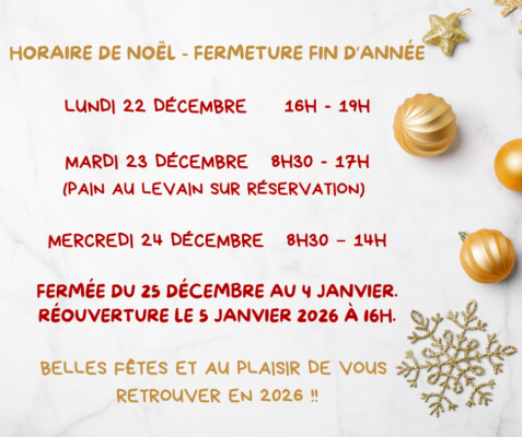 Horaires de fin d’année By Nathalie Chapuis|2025-12-14T12:45:49+01:00décembre 14th, 2025|Uncategorized|0 Comments Share This Story, Choose Your Platform! FacebookXRedditLinkedInWhatsAppTumblrPinterestVkEmail About the Author: Nathalie Chapuis Related Posts Offre de janvier décembre 29th, 2025 | 0 Comments Pain au levain au curcuma septembre 26th, 2025 | 0 Comments Leave A Comment Annuler la réponseComment Save my name, email, and website in this browser for the next time I comment.